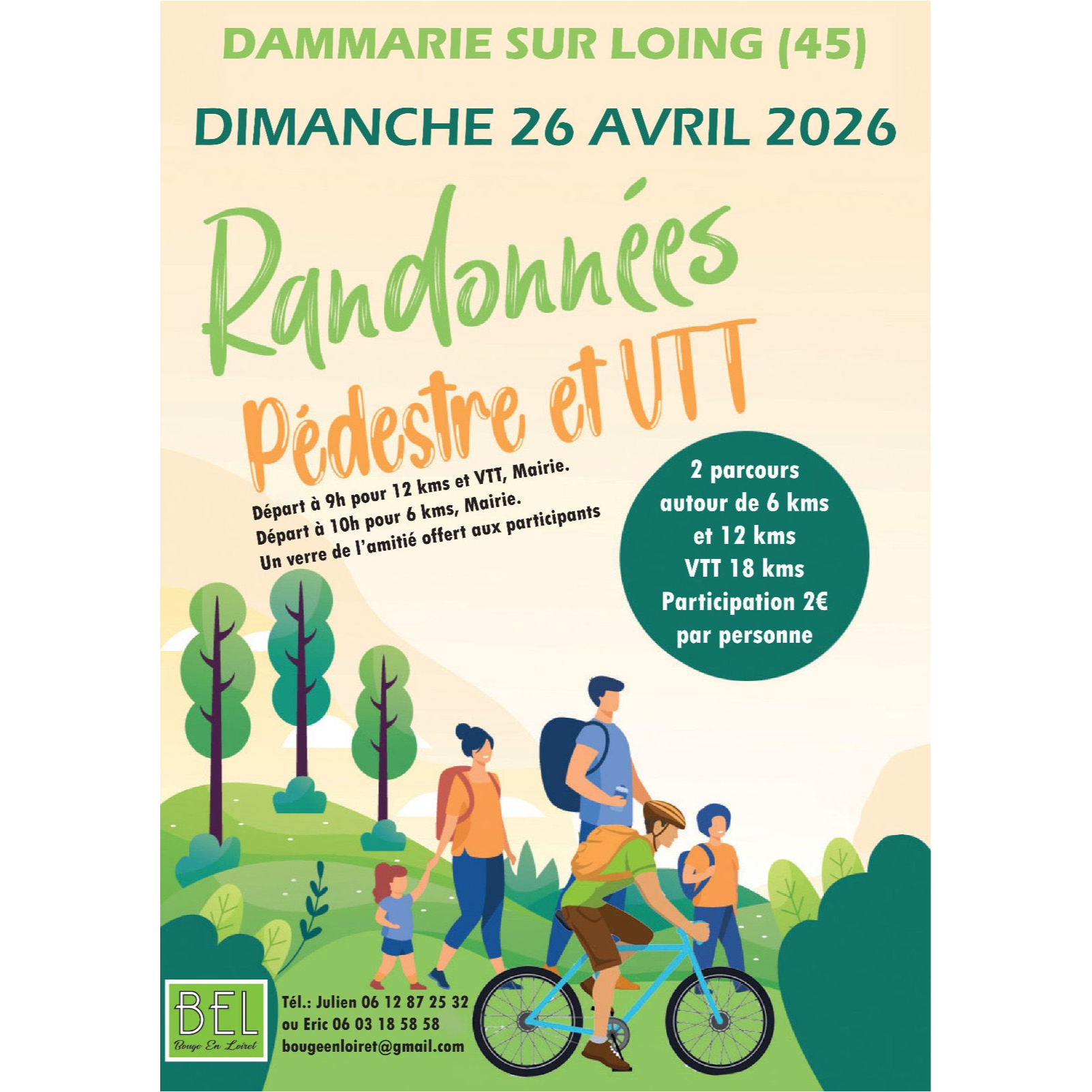 Le dimanche 26 avril, rejoignez-nous pour une promenade à pied ou à velo dans la campagne environnante. Il y a un choix de deux parcours pédestres, de 6km ou de 12km, ou bien un parcours VTT de 18km.